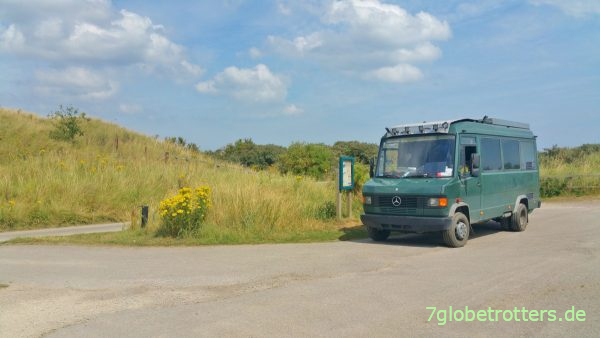 Nach 3 Nächten auf dem englischen Rasen war klar, dass wir heute nicht noch einen Tag am Strand von Anderby Creek würden verbringen können. Also zahlten wir die 14 Pfund pro Nacht, hielten noch einen Schwatz mit dem Betreiber und fuhren dann auf der kleinen Küstenstraße weiter nach Norden. Zur Mittagspause in den Dünen gab es wieder einmal 3 Pizzen. Dabei war es so heiß, dass nun alle nach Schottland wollen.