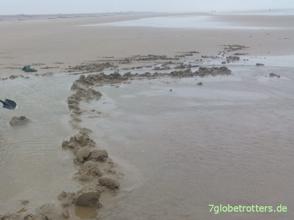 Bei Dungeness stellten wir uns dann direkt an den breiten Sandstrand und liefen trotz des Sturms zum Meer. Die Kinder waren dennoch nicht davon abzubringen, intensive Erdarbeiten auszuführen und haben es geschafft, einen kleinen Fluss anzustauen und umzuleiten.