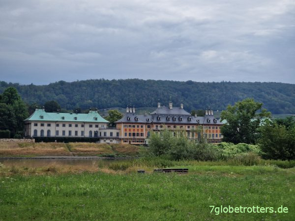 Der Regen steht am Himmel. So halten wir noch nicht einmal an, um vom Schloss Pillnitz ein richtiges Foto zu machen. Ein Freihandknipsbild vom Rad muss zur Erlebnisvisualisierung reichen.