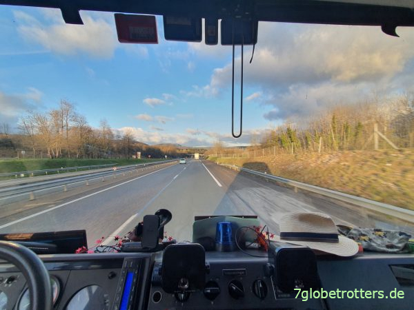 Jetzt beginnt die Spekulation, ob wir auf kleinen Straßen oder doch lieber auf der Autobahn über die Grenze von Frankreich nach Spanien fahren. Nehme lieber Landstraße über die Berge. Haben dadurch an der Grenze nach Spanien keine Probleme. Aber die Franzosen kontrollieren auf der Gegenspur. Glück gehabt, auch wenn Transit innerhalb der erlaubten Ausgangszeit ja prinzipiell erlaubt ist. Bin zwar gesetzestextmäßig gut vorbereitet, aber trotzdem ist mir unklar, ob wir einen Test brauchen oder die eidesstattlichen Erklärungen zur Symptomfreiheit ausreichen.
