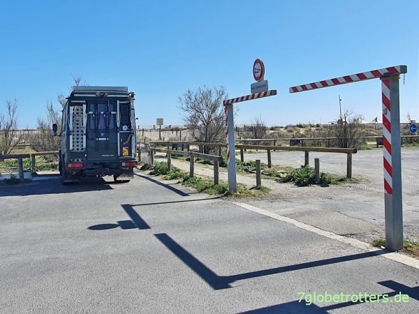Am Sandstrand südwestlich von Sete ist alles ein großer, höhenmäßig abgesperrter Parkplatz. Stelle den Bus eben auf die Entsorgungsstation. Wenn sowieso alles verboten ist, kommt es darauf dann auch nicht mehr an. Flitzen schnell zum Strand und hopsen ins Mittelmeer. Ist aber ziemlich kalt.
