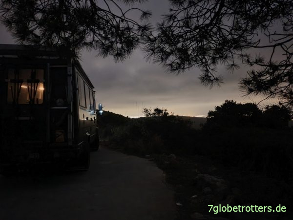 Barcelona. Ab jetzt übernimmt mein Jüngster die Reiseleitung. Mal sehen, was er so aus dem Wild-Swimming-Buch rausgesucht hat. Bei Garraf wird es dunkel. Die katalonische Ausgangssperre fängt bald an. Wir müssen uns irgendwo verstecken. Gurke also eine enge, steile und serpentinige Straße hoch in die Berge. Oben ist der Teufel los. Bestimmt Hundert Spanier pflegen hier nicht-Corona-konforme Privattreffen. Finden zwischen den kontakttollen Menschen und vor allem deren Kleinwagen gerade so einen Stellplatz. Dafür aber mit Blick über das Meer bis nach Barcelona.