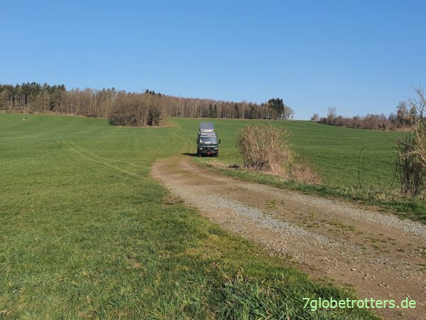 So offen wie hier auf der riesigen Wiese stelle ich den Bus normalerweise höchst ungern ab. Aber oben am Waldrand war es übel schräg und da es gestern nach der Gewaltetappe durch Frankreich sowieso schon recht spät war, ist das dann auch egal. Mit ein bisschen Verdunklung kann man sich nachts selbst auf einer offenen Wiese verstecken. Aber klar, schon zum Frühstück kommt der erste Hundespaziergänger vorbei und guckt komisch. Ist ja immer noch Lockdown.