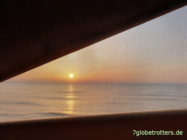 Karfreitag. 07:55 Uhr. Die Sonne geht über dem Meer auf. Nachdem wir gestern wegen der Zerstörung der spanischen Vegetation bisschen Stress mit einem Ranger hatten, ist heute früh alles friedlich und still.