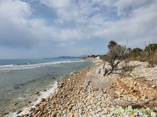 Wir laufen den ganzen Strand entlang, finden aber nur Betonblöcke und Steine, jedoch keinen Sand.