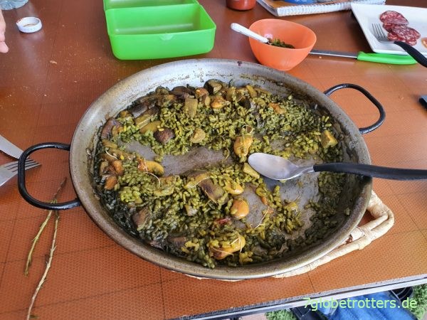 So sitzen wir bei offener Schiebetür im Bus und genießen unser coronakonformes Schlemmermenü. Die Jungs sind vor allem von den frittierten Tintenfischringen sehr angetan. Auch sonst verputzen sie ihre Teller restlos. Ich allerdings schaffe von der Paella höchstens ein Drittel.