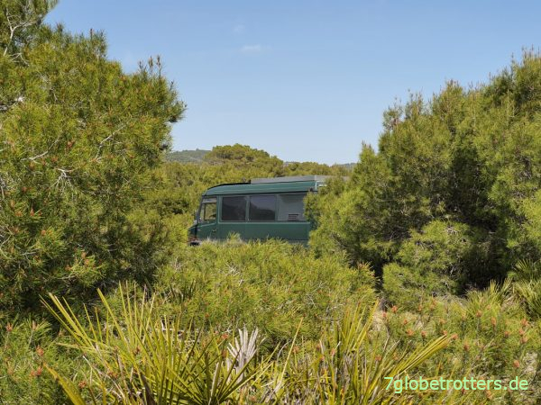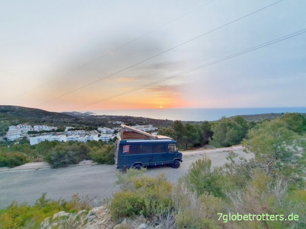 Übernachten im Wohnmobil ist an Spaniens Küsten zu normalen Zeiten immer so eine Sache, aber wo kein Wohnmobil, da kein Wohnmobil. Trotzdem setzen wir am Ende einer kleinen Nebenpiste die Abstandsregeln maximalst um. Ach, ich liebe RAL 6012 schwarzgrün. Müsste bloß mal das Aufstelldach auch noch so lackieren.
