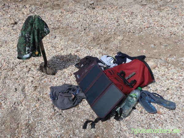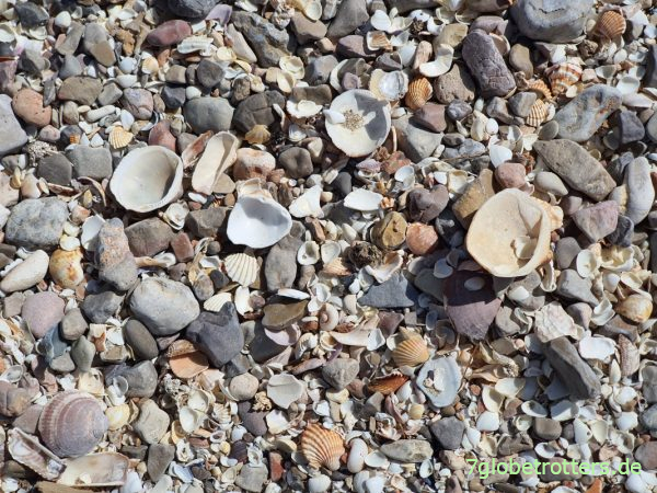 Endlich sind wir am Meer. Am Ziel. Hier würde ich ja bleiben, bis wir vertrieben werden. Allerdings sind die Jungs nicht so begeistert, da der Sand gar kein Sand, sondern ein Muschelbruch-Stein-Gemisch ist.