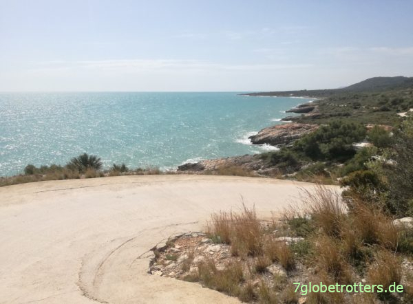 Nach dem Mittag packen wir zusammen und fahren runter zum Meer. Dort gibt es am Fuß der Berge eine schöne Piste. Allerdings war da irgendein Schild mit einem roten Kreis drumherum, bei dem mir gerade die Coronamaske vor die Augen gerutscht ist. Weiß beim besten Willen nicht mehr, was da drauf stand. Aber so ein wegen Corona zumindest touristenmäßig fast ausgestorbenes Land hat eben auch Vorteile.