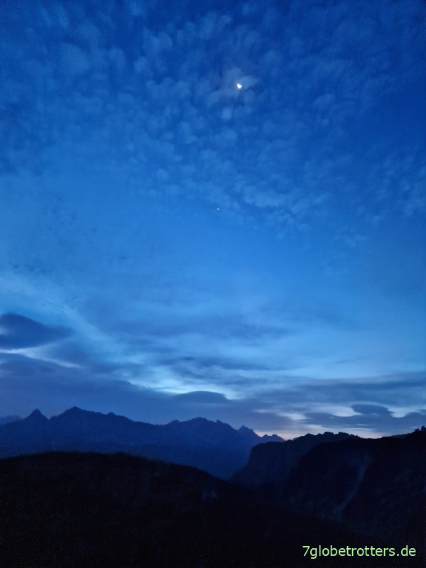 Bei der Kälte in den Bergen kann man eigentlich so wie gestern nur mit Sonnenuntergang ins Bett. Die Kunst ist, früh dann trotzden liegen zu bleiben, bis die Sonne aufs Zelt scheint. Aber das kann nicht jede. Ist aber auch gut, denn so haben wir mal Fotos von der Zeit vor Sonnenaufgang.