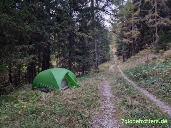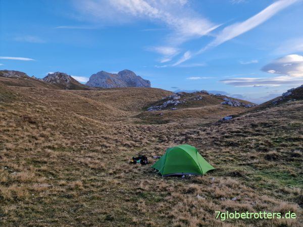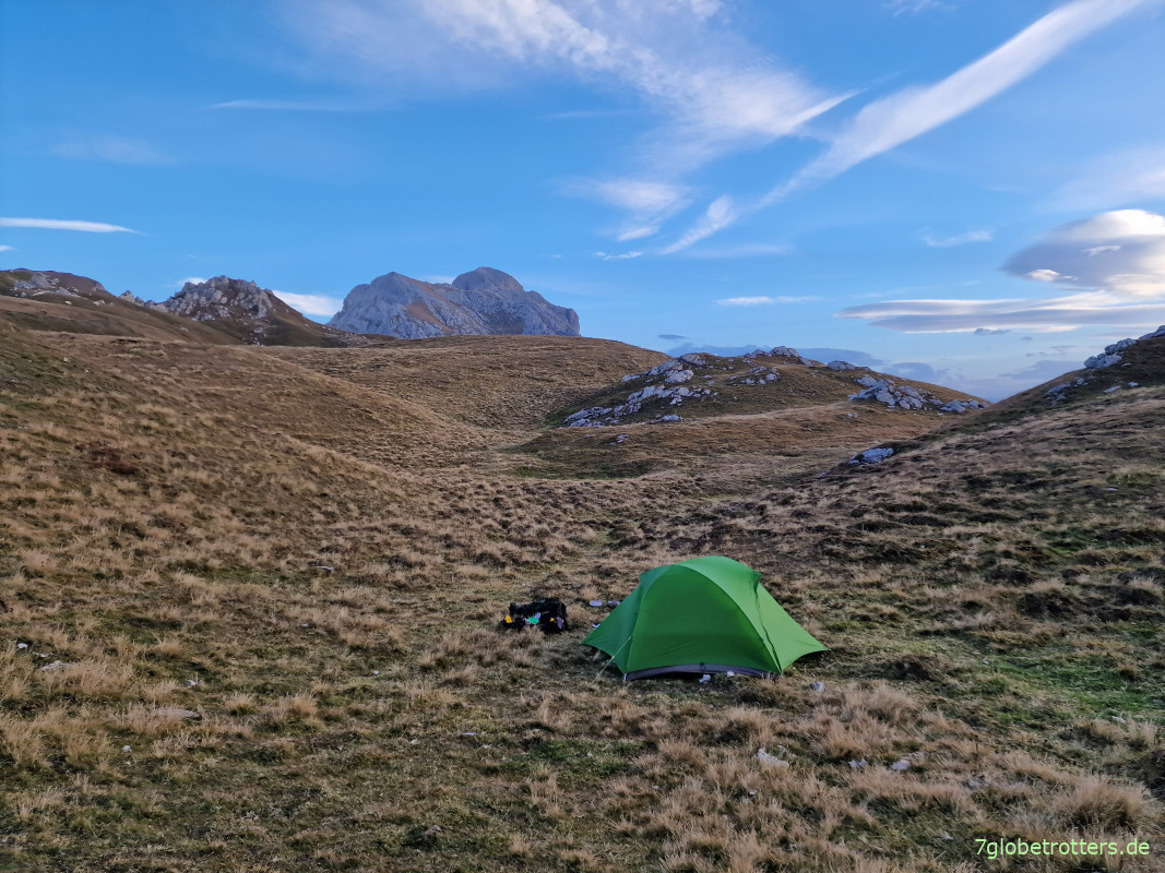 Erst als die Sonne ganz weg ist, bauen wir auf dem schon vorher ausgekundschafteten Biwakplatz das Zelt auf.
