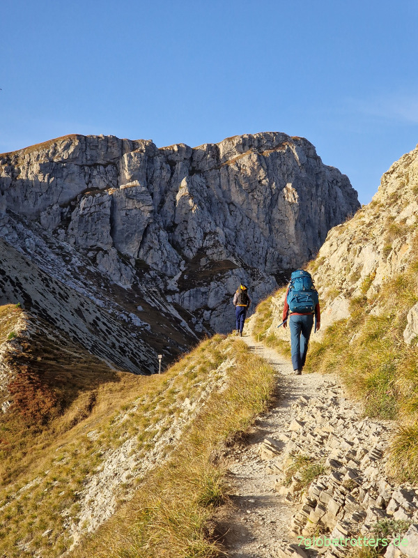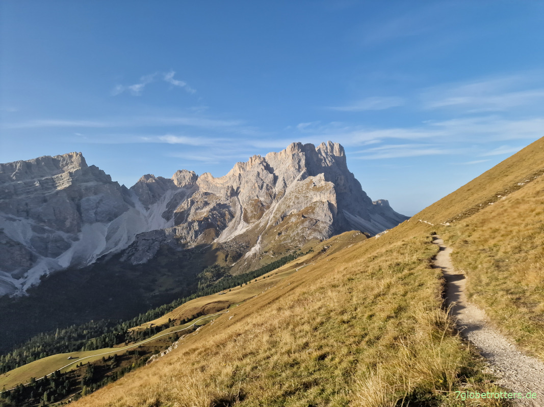 Der Weg führt rund um die sonnige Ostflanke der Geislerspitzen immer leicht bergan. Das sorgt für Wärme von innen und außen.