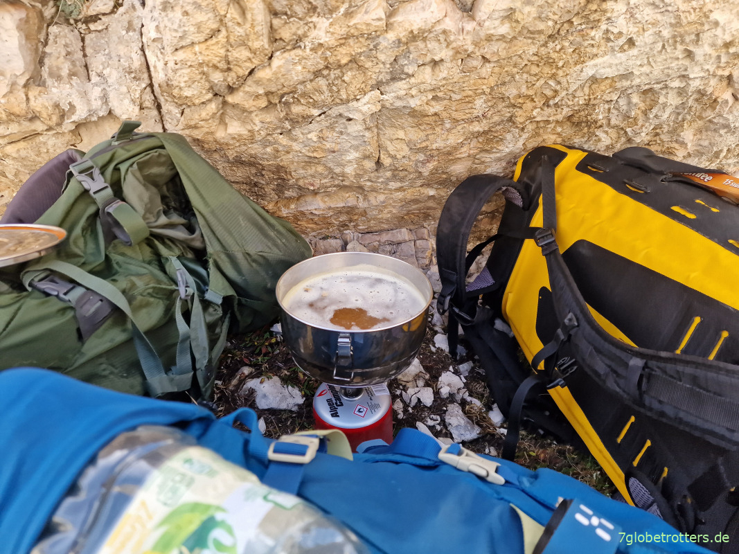 Allerdings wird es draußen trotz Morgengymnastik schnell kalt. Also müssen die beiden alten Berghasen auch vor der Zeit aufstehen. Naja, was soll’s. Erstmal Tee kochen.