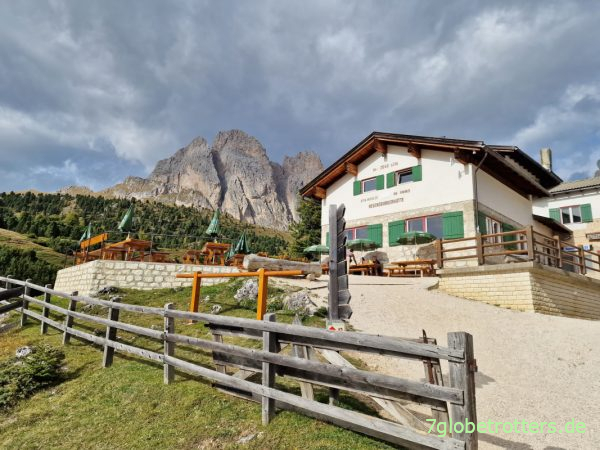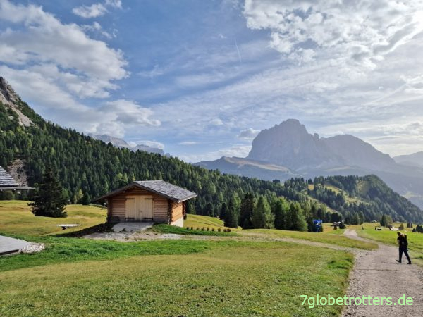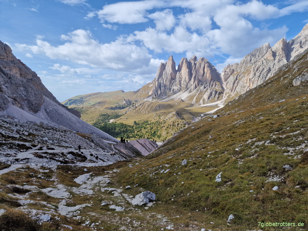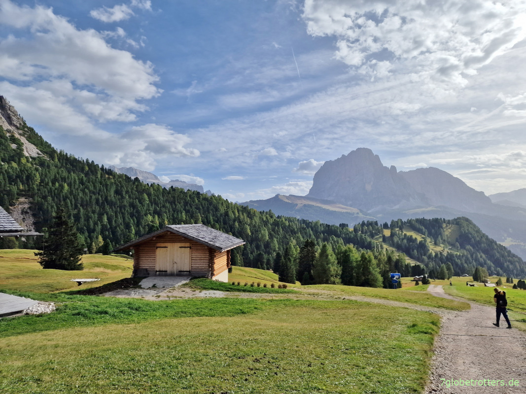 Wir bleiben nur eine halbe Stunde, denn wir wollen ja runter nach St. Christina und auf der anderen Seite rechts vom Langkofelstock wieder hoch Richtung Tierser Alpl. Das sind also noch ordentlich Höhenmeter. Aber wir sind frisch und bergab läuft es sowieso ganz gut, sodass ich meine Bedenken lieber für mich behalte.