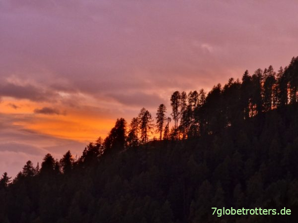 Unser Jüngster findet derweil im Cislesbach eine Badestelle mit einem Hauch von Sandboden sowie einer Dusche. Er geht auch als erstes rein. Da machen sich die Männer hübsch, auch wenn die Reinigungswirkung von eiskaltem Wasser natürlich eingeschränkt ist. Aber wir wissen eben, dass man beim Dolomitenbiwak nicht auf eine warme Dusche zu warten braucht. Was dagegen öfter mal frei Haus geliefert wird, ist ein schöner Sonnenuntergang.