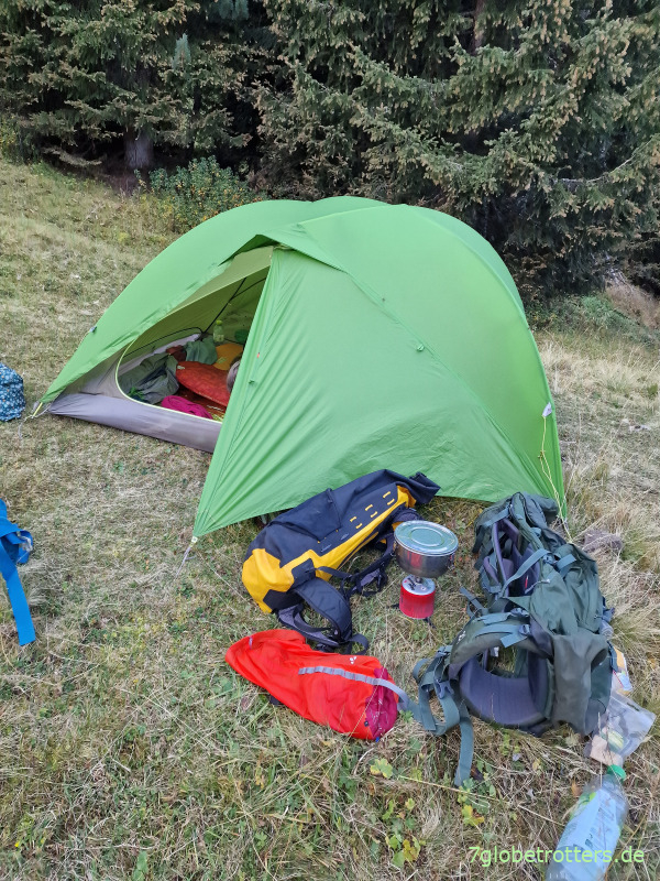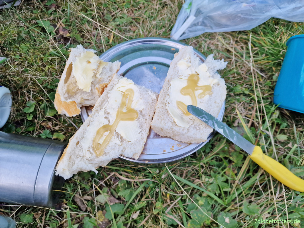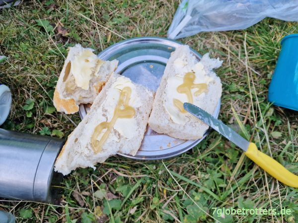 Dafür genießen wir dank des gestrigen Supermarktbesuchs in St. Christina Baguette mit Butter und Honig, wobei meine neueste Erfindung ist, das Baguette auf dem heißen Teetopf vorzuwärmen. Das hat echt schon Züge von Wellness im Dolomitenbiwak. Mal sehen, ob’s hilft.
