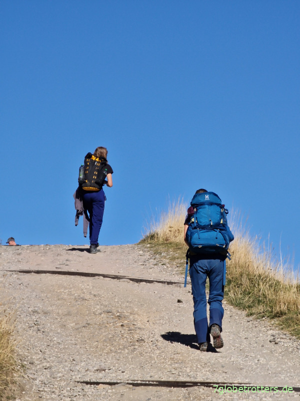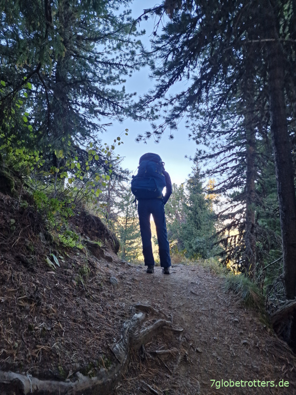 Klamottenmäßig sind wir ja mit winddichten Regenhosen unterwegs, was allerdings bei diesem herrlichen Wetter und bei dieser Streckenführung durch den Wald gar nicht erforderlich, sondern sogar eher hinderlich ist. Da hätte es auch eine Stoffhose gemacht. Aber die blaue Monviso ergibt mit dem blauen Rucksack schon ein stimmiges Gesamtbild wie bei einer richtigen Bergexpedition.