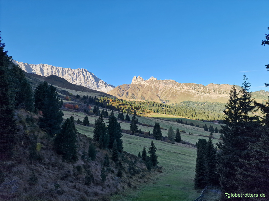 Selbst Autos fahren einige herum. Die Seiser Alm ist echt ganz schön abschreckend. Schön, aber abschreckend. Was allerdings gut ist, ist die Aussicht auf die umliegenden Berge.