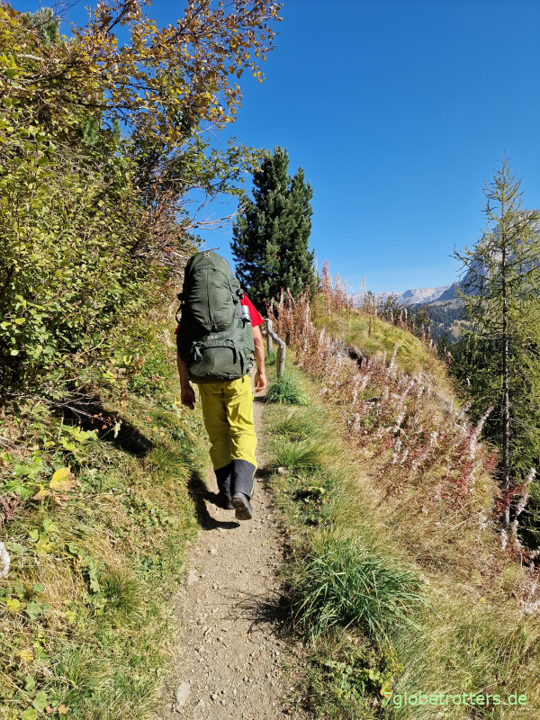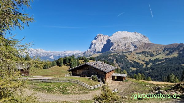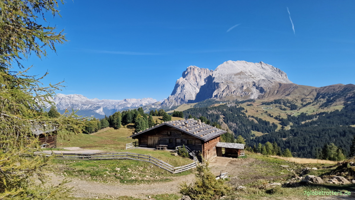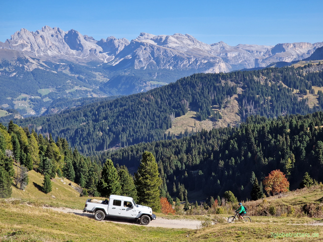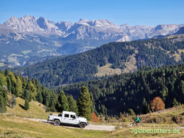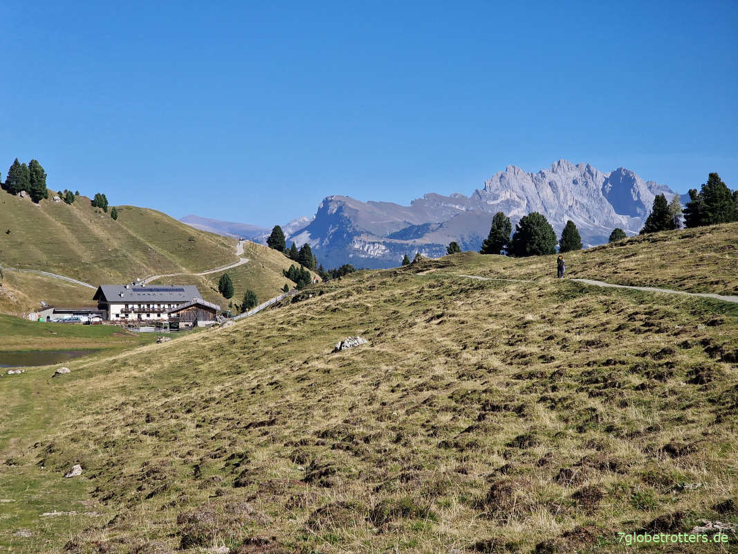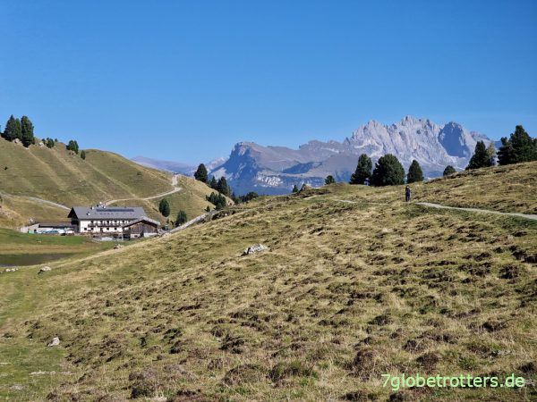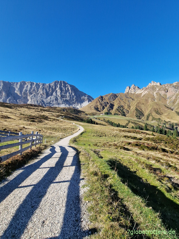 Aber was soll’s, es ist schöne Sonne, der Himmel ist blau und die Sicht ist gut. Und es gibt selbst auf der Seiser Alm Wege, wo keine Elektroräder entgegenkommen.