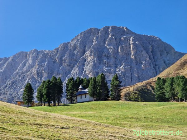 Eigentlich wollte ich Mittagessen am Tierser Alpl machen, aber das rückt außerhalb des Blickfeldes. Dafür freuen wir uns an den blonden Haflingern, der kleinen Kapelle und der Aussicht am Dialer Alm-Haus auf 2.145 m.