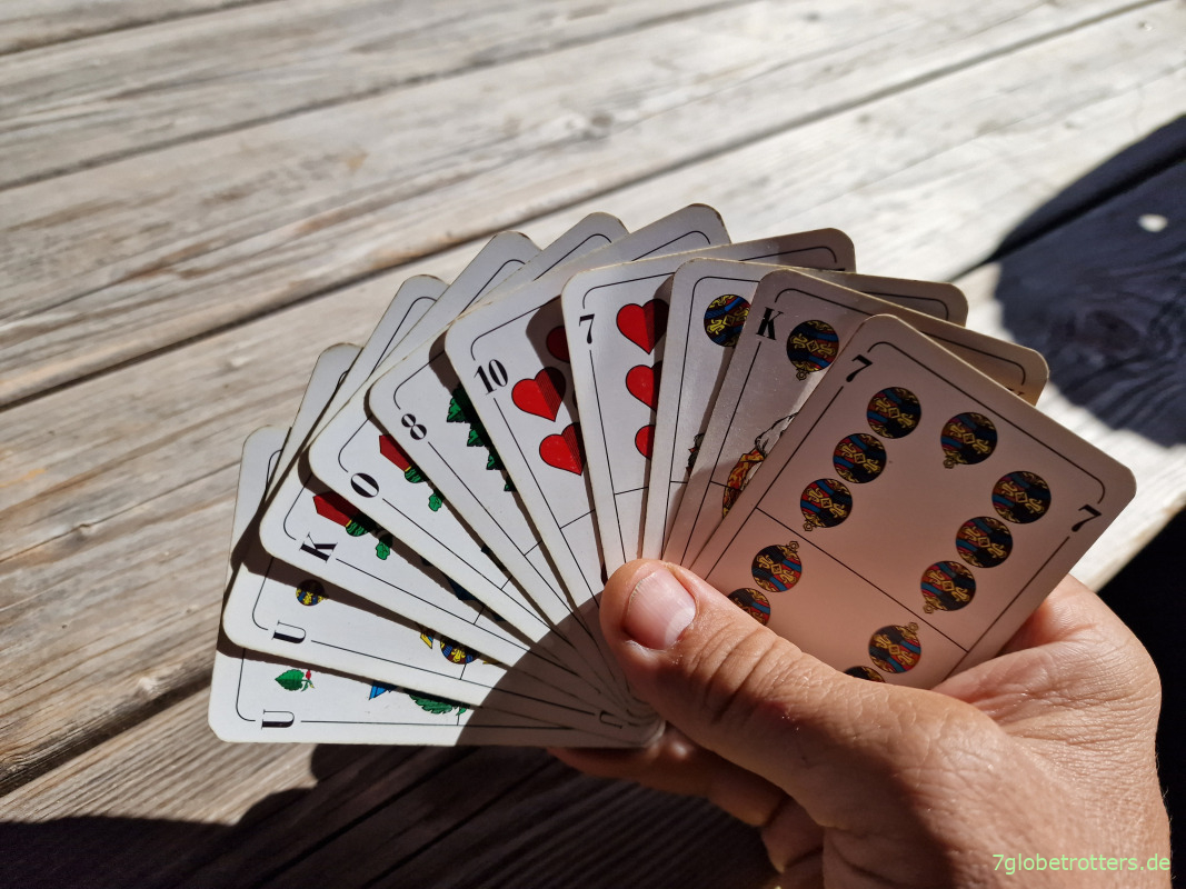 Nach dem Mittagessen ziehen wir uns zur Verlängerung der Pause in die schattige Froschhütte zurück und spielen dort Skat. Wir müssen nämlich trödeln, damit wir nicht zu zeitig in Compatsch an der Seilbahn sind. Heute bei dem Kaiserwetter fällt das ja leicht.