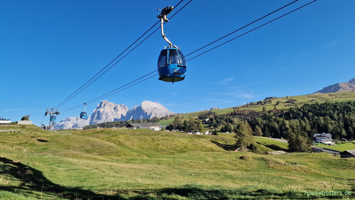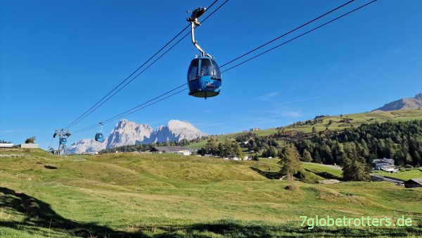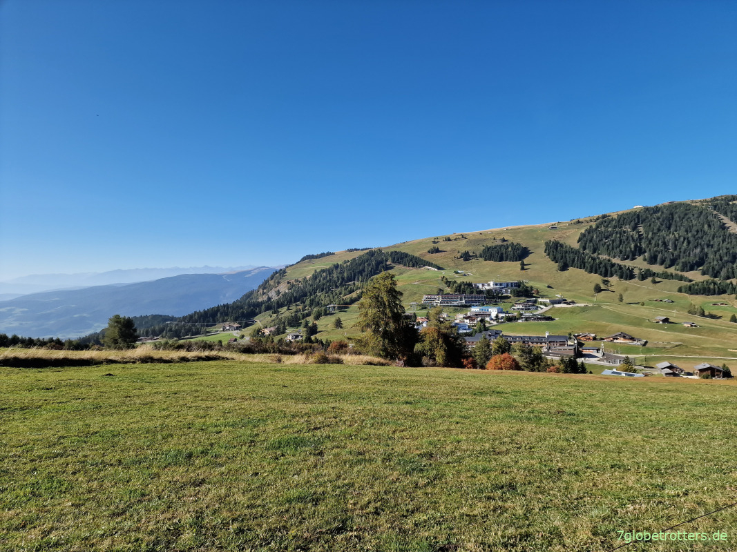 Da unten in Compatsch an der Bergstation der Seiser-Alm-Seilbahn wird unsere Wanderung zu Ende gehen. Aber der Zug fährt erst morgen, also bleiben wir noch hier oben.