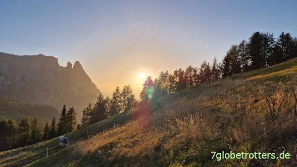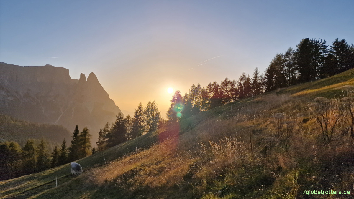 Aber wir haben Sonne bis zuletzt und Aussicht über die ganze Hochalm. Sehen, wie langsam der Verkehr zum Erliegen kommt und dann die Sonne neben dem Schlern untergeht. Echt schön.
