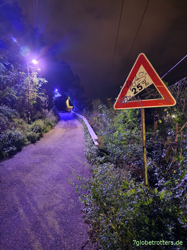 Egal, wir sind zu Fuß unterwegs. Das geht immer. Viel drängender ist die Frage, wo ich hier an diesem Steilhang einen Platz für unser Zelt finden soll. Denn lange laufen kann bzw. will kurz vor Mitternacht niemand mehr. Hab das aber schon erwartet und durch intensives Luftbildstudium ein paar potenzielle Plätze rausgesucht. Und tatsächlich stellt sich meine etwas verrückte Idee, direkt über dem Portal eines Autobahntunnels zu zelten, als durchaus praktikabel heraus. Klar, romantisch ist anders, aber besser als auf dem Bahnhofsvorplatz ist das hier allemal. Vor allem aber gerade und ungestört.