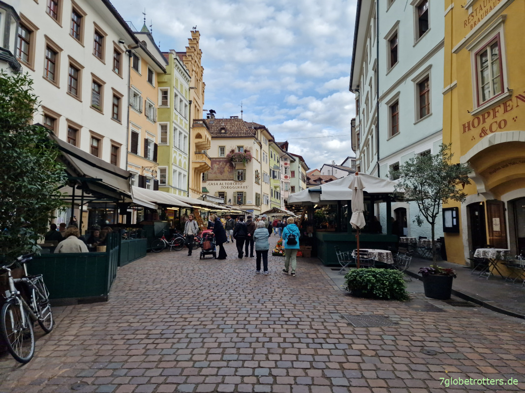 Dann spazieren wir noch durch die Altstadt von Bozen, kaufen Verpflegung und setzen uns am Bahnhof auf eine Bank.