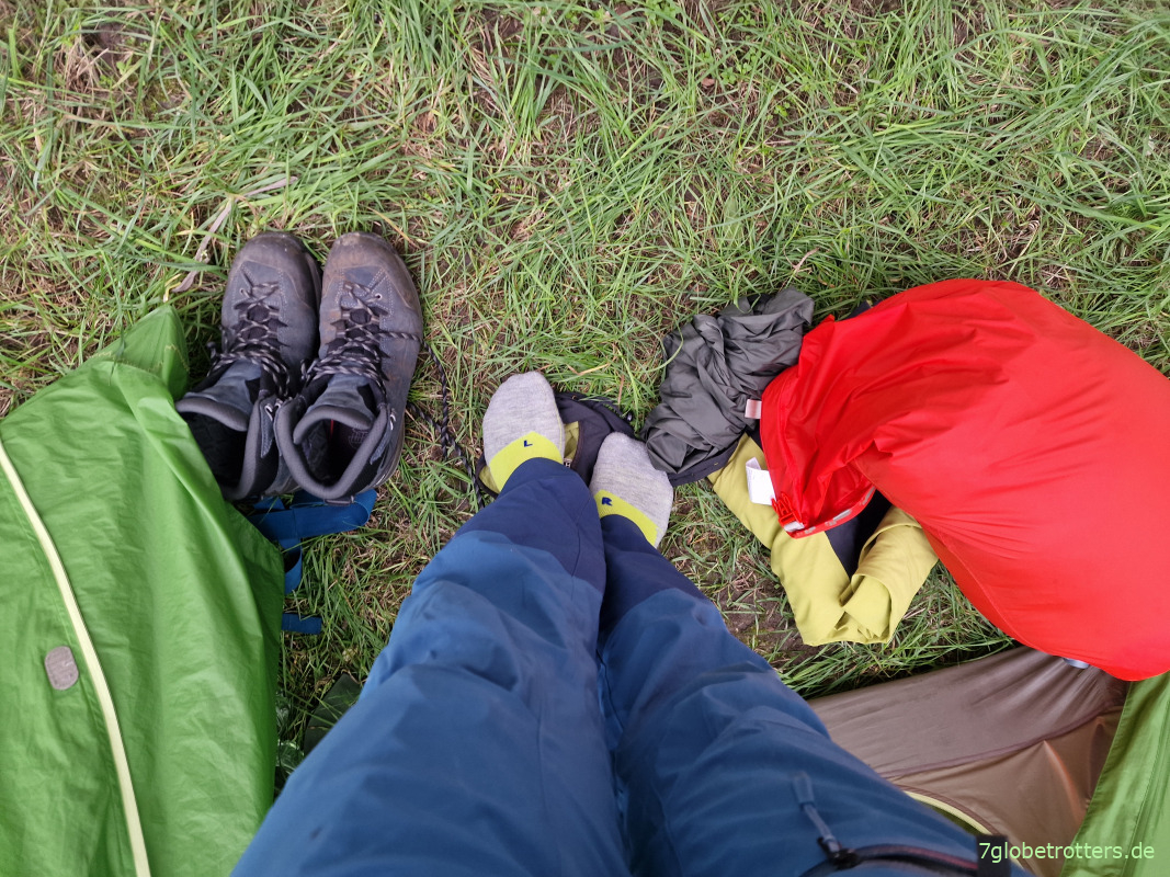 Warm wird es auch noch, so dass ich nicht nur den Reißverschluss meiner Regenhose hochziehe, sondern gleich das ganze Ding hochkrempel.