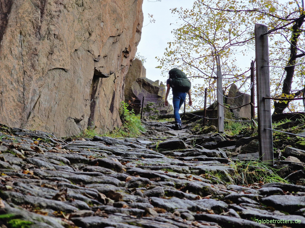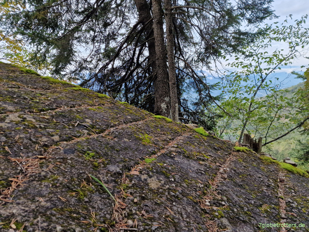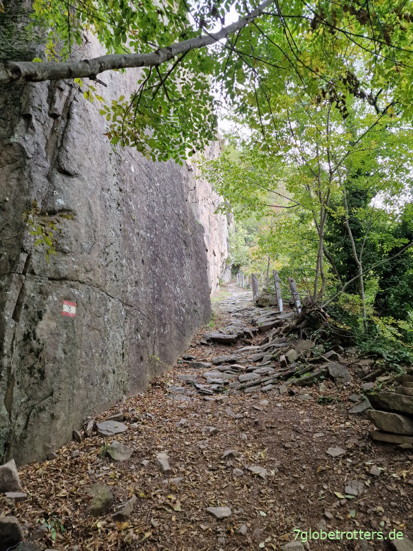 Der Leiferer Höhenweg schmiegt sich hier ganz eng an die Felsen.