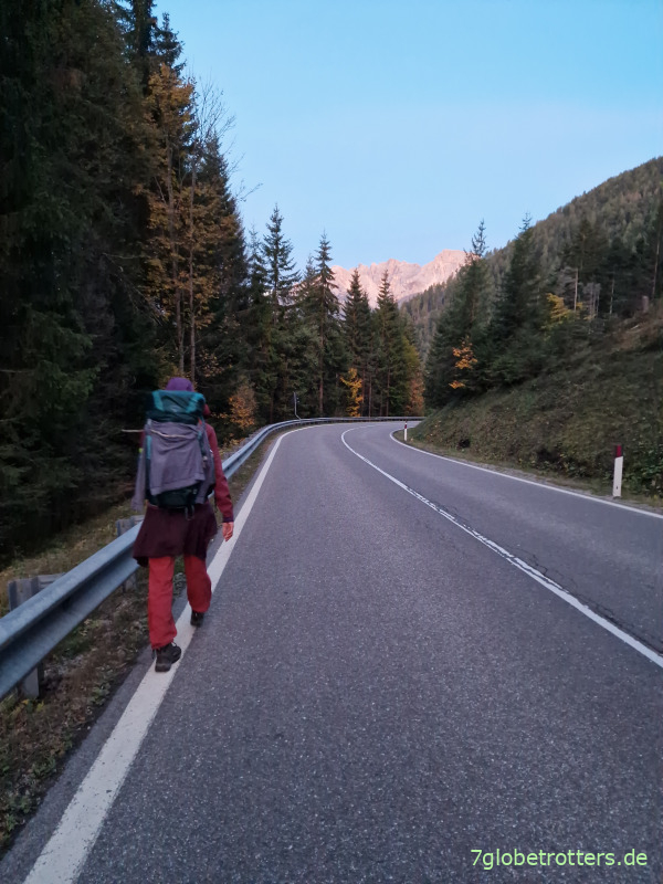 Es ist nämlich schon 17:40 Uhr, und ich habe Bedenken, ob wir das ganze Programm von Bozen über das Latemar zum Karerpass überhaupt in drei Tagen schaffen. Also müssen wir abends ein bisschen länger laufen. Kommt, da hinten leuchtet das Latemar doch schon. Da beginnen die richtigen Dolomiten. Ist zwar dumm, an der Straße lang zu laufen. Das ist mir aber lieber, als wegen sinnloser Umwege an der Latemarüberschreitung zu scheitern. Und so wird gelaufen und gelaufen.