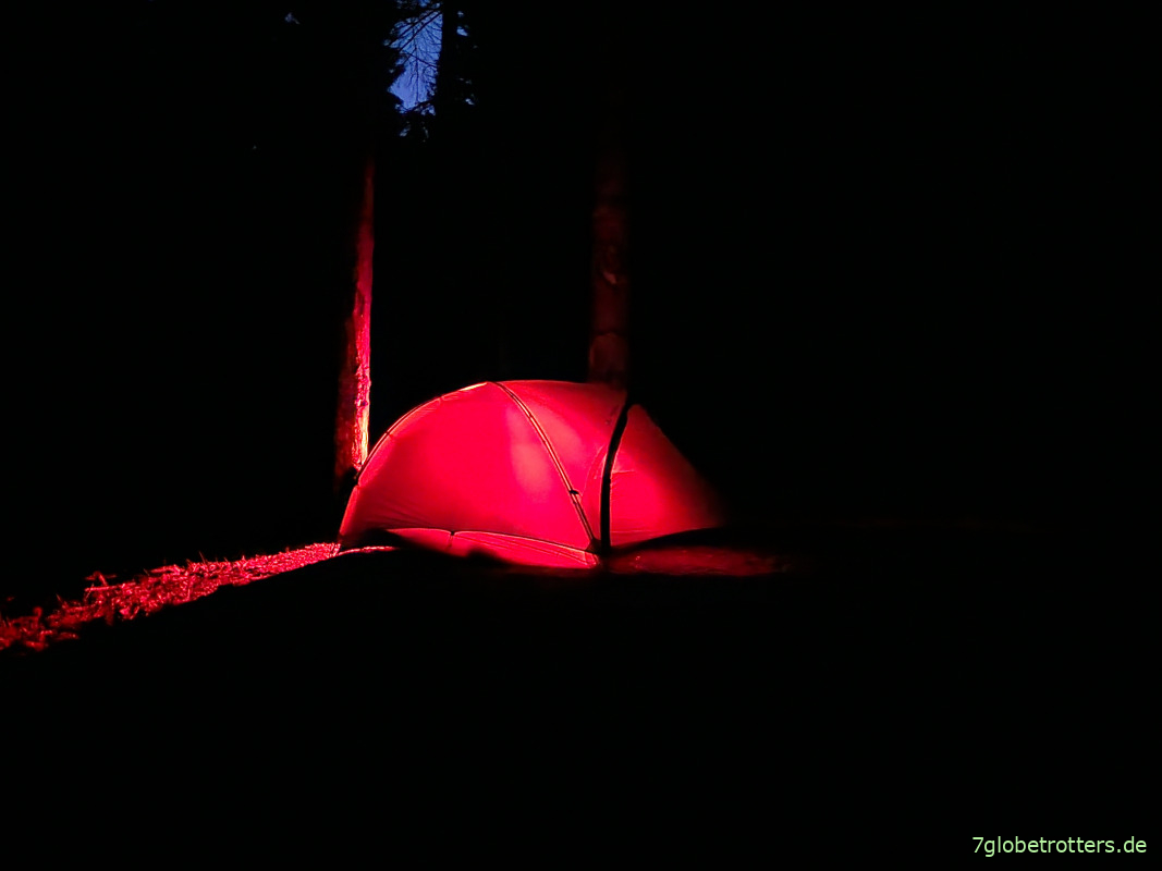 Erst als es dunkel wird und die Beschwerden eindrücklicher vorgetragen werden, fange ich überhaupt erst mal an, einen Biwakplatz zu suchen. Aber nun kommt und kommt kein Zeltplatz mehr. Mit einem Kind an jeder Hand würde ich jetzt noch eine Runde Gummibärchen ausgeben und laufen, laufen und laufen. Aber so funktioniert das nicht mehr, da fehlt einfach das Grundvertrauen. Naja, wenigstens kann ich nach wie vor irgendwo frei zelten und muss nicht in so ein dummes Spa gehen. Um es aber nicht allzu sehr auf die Spitze zu treiben, erkläre ich dann doch die erstbeste Gelegenheit an einer Ausweichstelle zu unserem Nachtquartier. Lasse aber lieber mal das Rotlicht an, denn wir stehen direkt an der Fahrstraße.