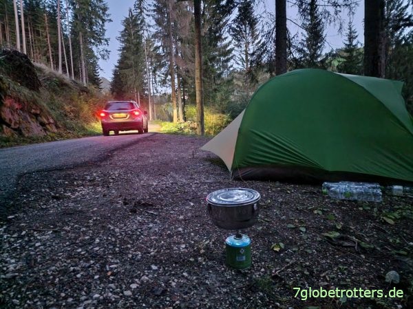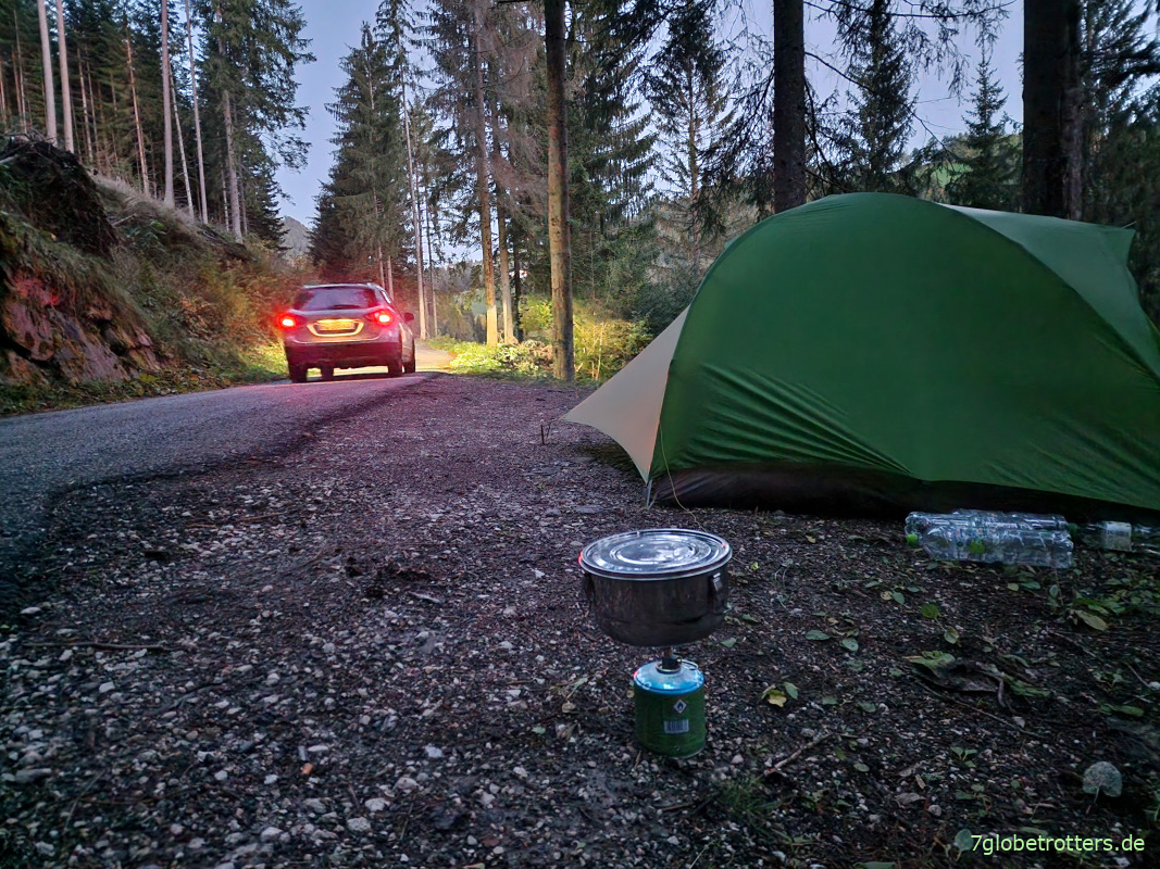 Ich hatte ja gestern Abend nach dem Aufstieg über den Leiferer Höhenweg schon ein schlechtes Gefühl, aber das hier ist wirklich der mieseste Biwakplatz aller Zeiten. Gut, die Wanderung von Bozen hier hoch war lang und wir mussten irgendwo zelten. Wenn man dann keine Hängematte hat, bleibt am Steilhang nur der Platz neben dem Asphalt. Ist zwar keine Durchgangsstraße, aber 5 Autos sind 5 zu viel. Einer hupt, einer fährt zurück, um zu gucken, aber letztlich sagt keiner was. Das ist das Gute an so einem Hightech-Zelt in Vaude-Grün. Da wird man nicht verwechselt. Wer sowas hat, den lässt man gern in seinem Vorgarten zelten. Hocke dennoch schon 7 Uhr vor dem Zelt, koche Teewasser und beruhige die Anwohner mit meinem seriösen Erscheinungsbild.