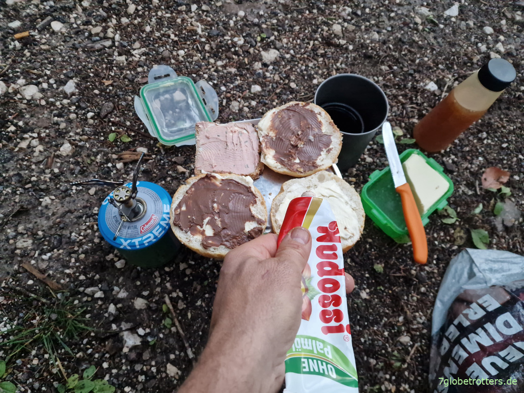 Aus der Kartusche kommt bei der Kälte kaum noch Gas, aber wenn ich die mit beiden Händen aufwärme, geht es wieder. Toaste dabei auf dem Topfdeckel die gestrigen Brötchen. Und es gibt mit Nudossi, Honig oder sogenannter Leberwurst sogar Wahlaufstrich.