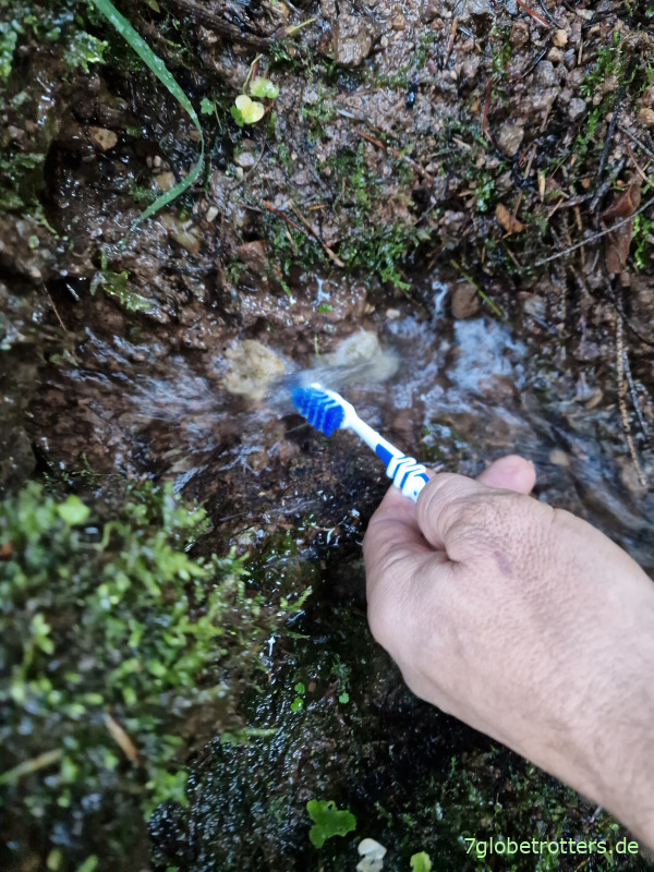 08:00 Uhr sind Zelt, Isomatten und Schlafsäcke verstaut sowie die Zähne geputzt. Duschen im Rinnsal neben der Straße war gestern Abend schon dran. Das reicht.