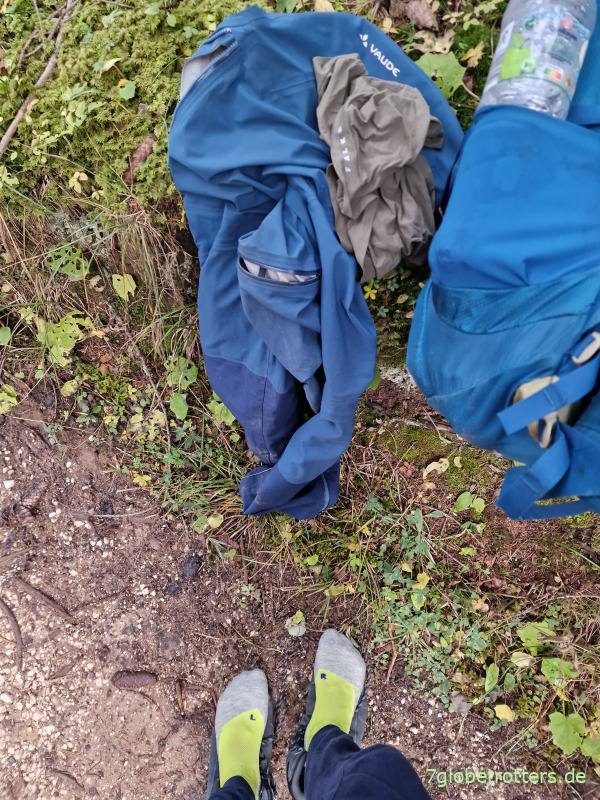 Auf 1500 m wird es auch mir zu warm, und ich ziehe die Schlafanzughose unter der Regenhose aus. Das Problem an den dicken Wandersocken von Falke ist, dass man damit zwar auch mal auf kalten Steinen stehen kann, ohne gleich zu frieren. Aber man merkt die Feuchtigkeit zu spät. Stelle mich also lieber auf die Bergschuhe.