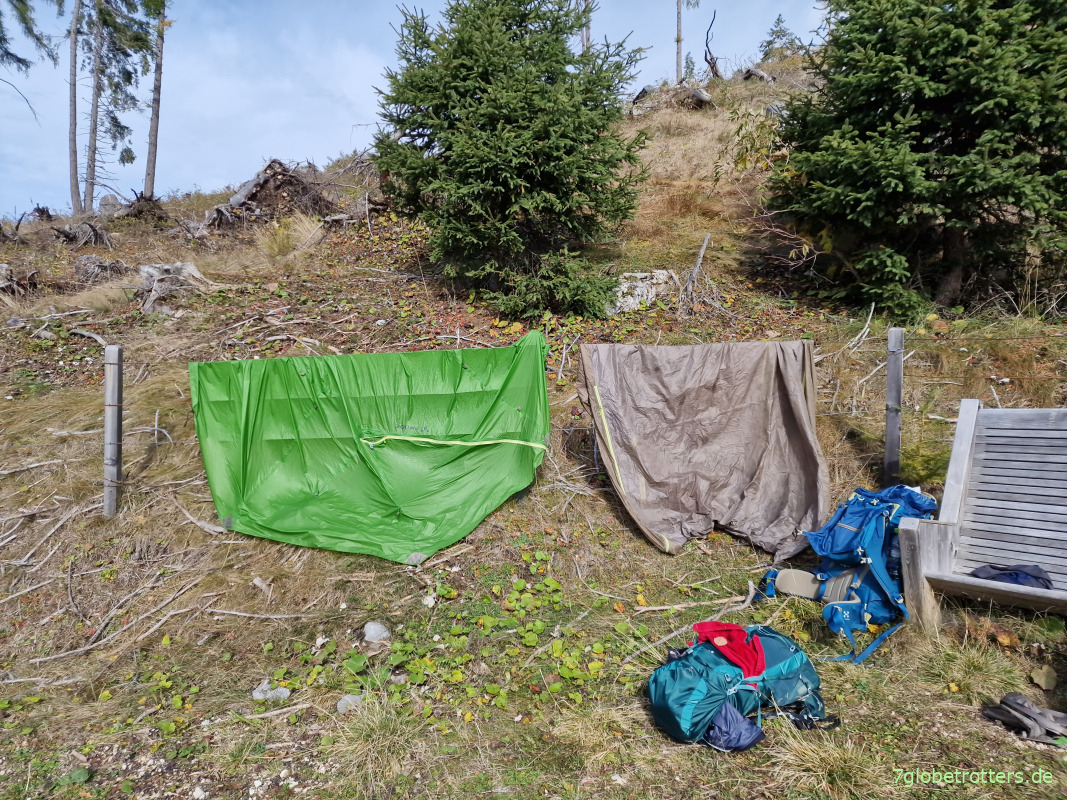 Nach 150 Höhenmetern nochmal Pause, diesmal sogar in der Sonne. Ideale Bedingungen also, um das Zelt zu trocknen. Das Material verträgt das zwar, aber ein nasses Ultraleichtzelt wiegt mehr.