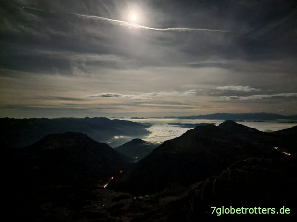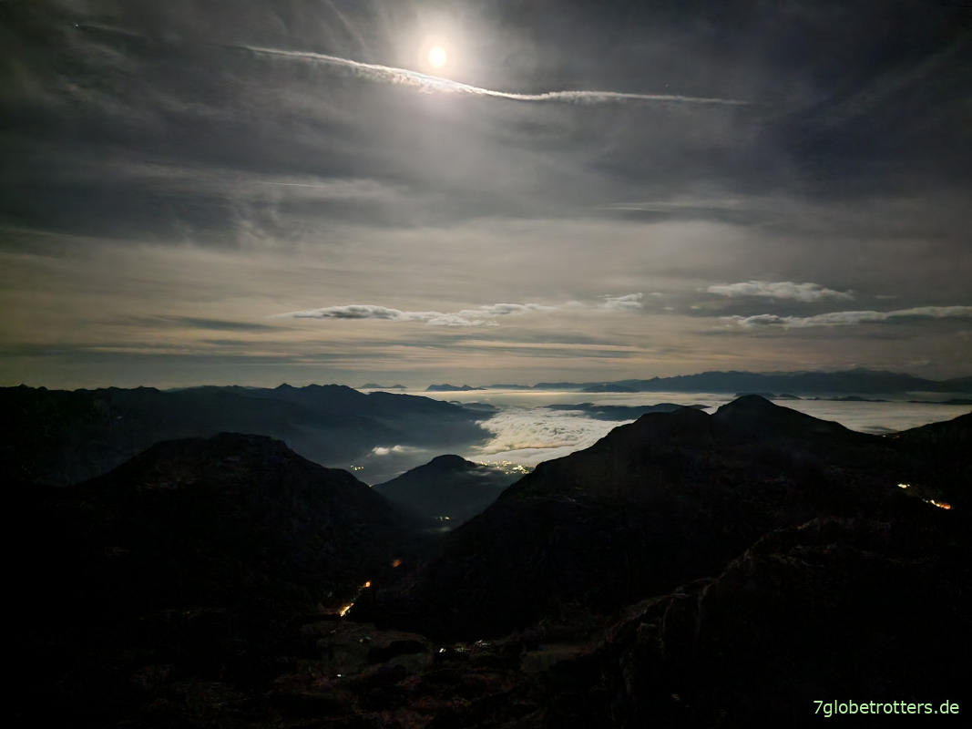 Nach 5 Stunden Tiefschlaf wache ich wegen zu viel Hitze auf. Ziehe also bis auf Unterhose und T-Shirt alles aus und denke mir, doch mal nach dem Mond schauen zu können. Und zwar genau in dieser Reihenfolge. Naja, egal. Schlüpfe diesmal wenigstens schnell in die Bergstiefel rein. Gefühlt ist es um 01:30 Uhr 10 Grad wärmer als am Abend. Aber das Thermometer zeigt unverändert 2°C. Da sieht man wieder einmal, was Gewöhnung ausmacht.