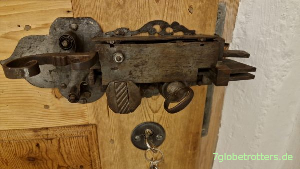 Das Hotel stellt sich als Residenz mit 8 Wohnungen heraus. Also ohne Frühstück oder irgendwelchen Service. Dafür aber mit einer recht großen Wohnung direkt unterm Dach. Eigentlich sehr hübsch mit Küche, Wohnzimmer und Bad, sogar mit Badewanne. Am besten gefällt mir aber das alte Kastenschloss, auch wenn das leider nicht funktioniert.