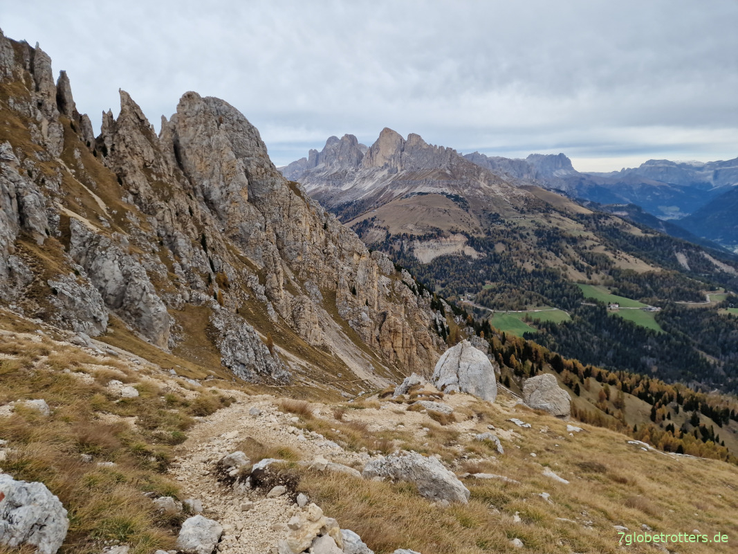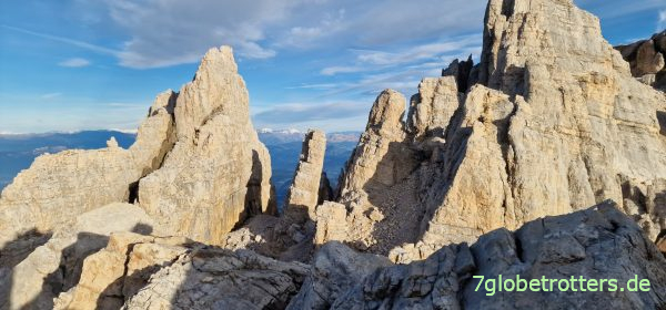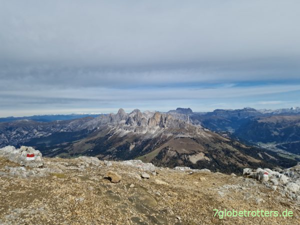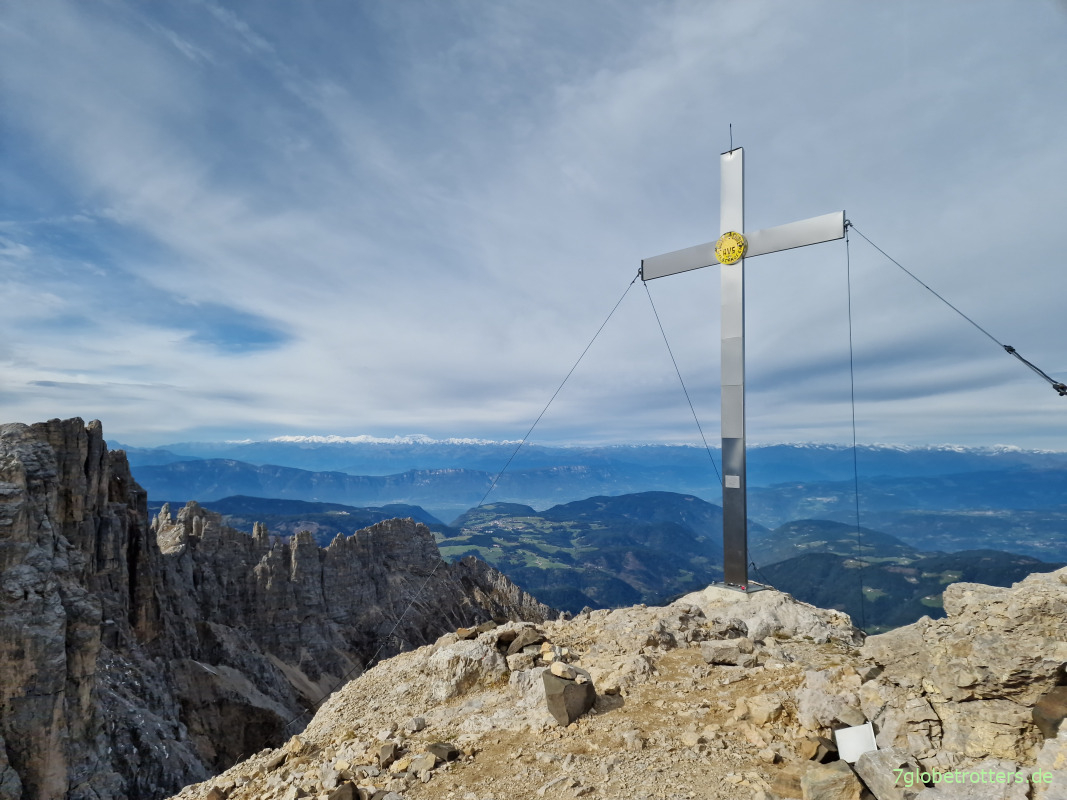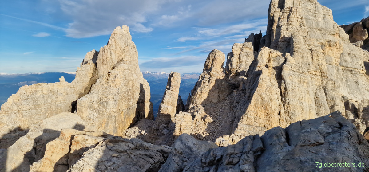 Von der östlichen Latemarspitze (2.801 m) sieht man schön die gesamten Dolomiten, hier den Rosengarten. Und genau zwischen Latemar und Rosengarten liegt der Karerpass mit 1.750 m. Da will ich heute noch hin.