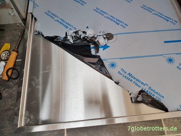 3 Tage später ist meine Edelstahl-Duschwanne fürs Wohnmobil da. Gleich mal auspacken und die dicke Schutzfolie abziehen. Sehr solide Schneide-, Kant- und Schweißarbeit. Ein Fußschmeichler aus 1,5 mm dickem, geschliffenem Edelstahl. Schön.