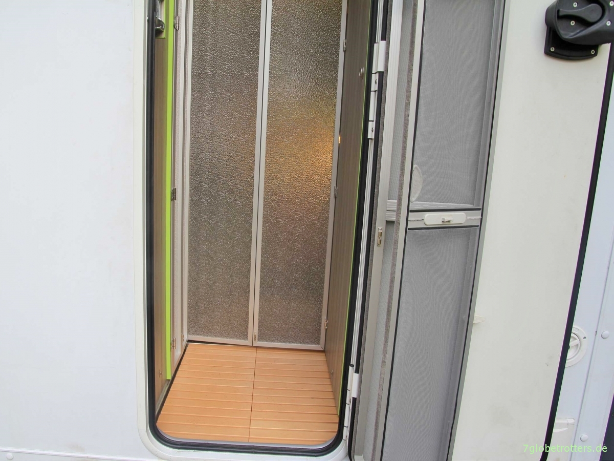 Mochte aber selbst auf dem großen LKW keinen separaten Raum für die Dusche verschwenden. Der Eingangsbereich ist für die Dusche ein guter Platz. Kann da die Tür zum Lüften öffnen. Der Schnee tropft von den Schuhen gleich in die Duschtasse. Und auch Dreck spült sich schnell weg. Zudem ist die Dusche mit aufgeklappten Duschwänden auch ein guter Trockenraum und Windfang.
