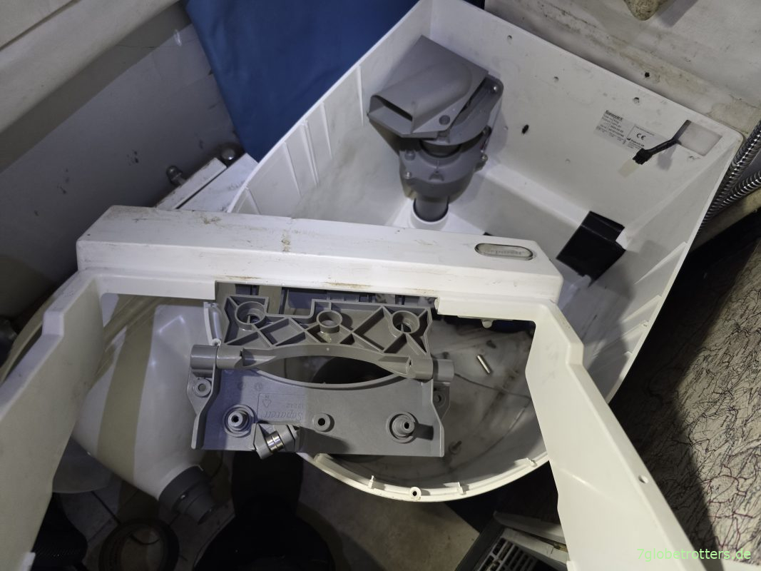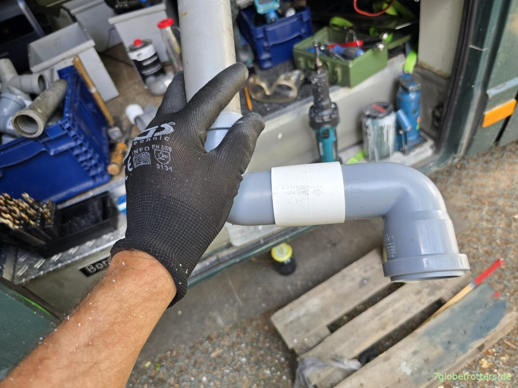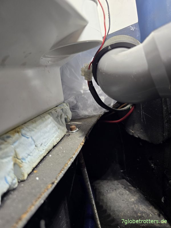 Gleich alles zerlegen konnte ich aber wegen meines Unfalls nichts. Erst mit frisch reparierter Hand merke ich, dass das Abluftrohr von unten nur aufgesteckt ist und sich losgerüttelt hat. Ist allerdings mein Fehler, da ich die Toilette höher gelegt und hinten einen freien Zugang zum Unterboden gelassen habe. Angesichts dieses gravierenden Fehlers wundere ich mich aber schon, warum die Toilette nicht noch mehr gestunken hat. Es war etwas zu riechen, aber nicht dramatisch schlimm.