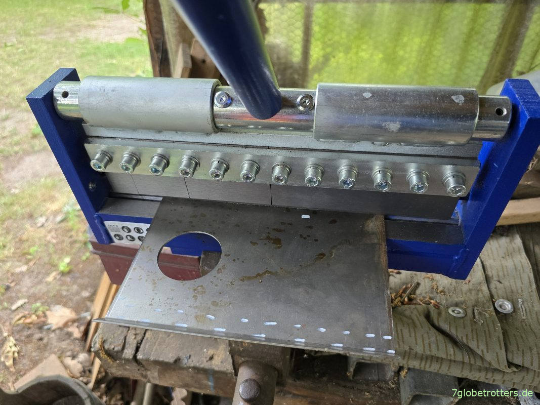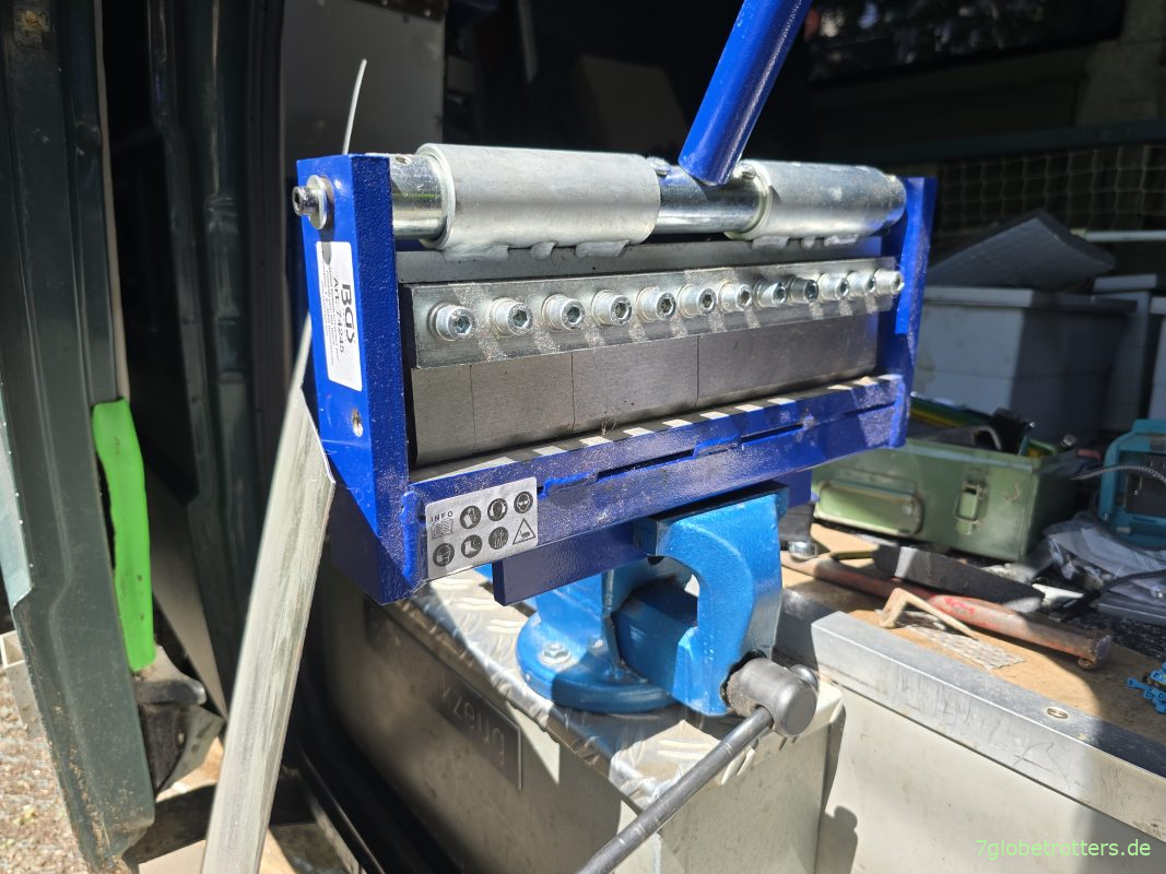 Da kann ich auch endlich mal meine neue BGS-Mini-Kantbank für Bleche bis 30 cm Breite ausprobieren. Hatte die erst ganz optimistisch im Wohnmobilschraubstock eingespannt. Also am Schraubstock liegt es nicht, aber dem fehlt es da ein bisschen an Verankerung.