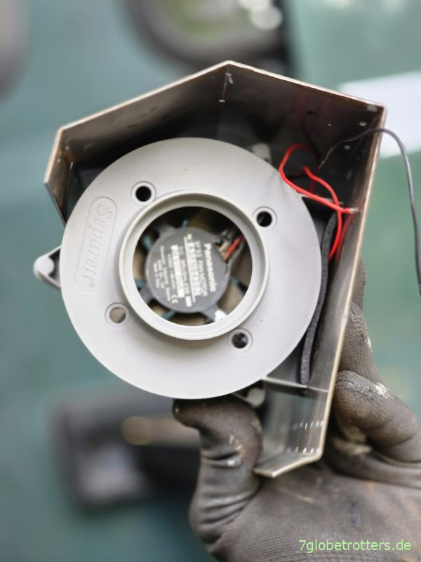 - Der 24-V-Lüfter 92 x 92 x 25 mm mit abgesägten Ecken passt zwar und ist flüsterleise, bringt aber in dieser Einbausituation nur den halben Luftdurchsatz (NMB 09225SA-24L-EA, 68 m³/h, 2.400 U/min, 25 dB, Kugellager): Klick