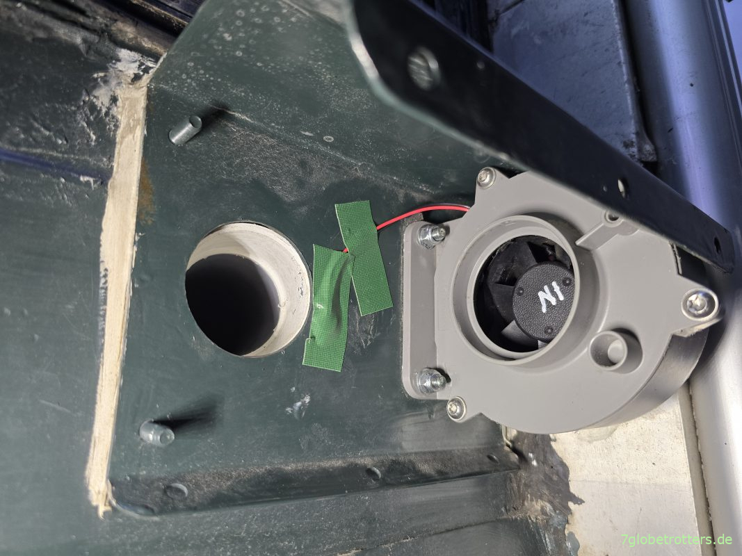 Wenn ein Lüfter draußen brummt, ist das nur halb so schlimm. Hauptsache, die Toilette funktioniert und riecht nicht. Was allerdings gar nicht geht, ist mein neues grünes Panzerband für den fliegenden 24-V-Anschluss des 60-mm-Lüfters. Das hätte ich auch gern in RAL 6012.