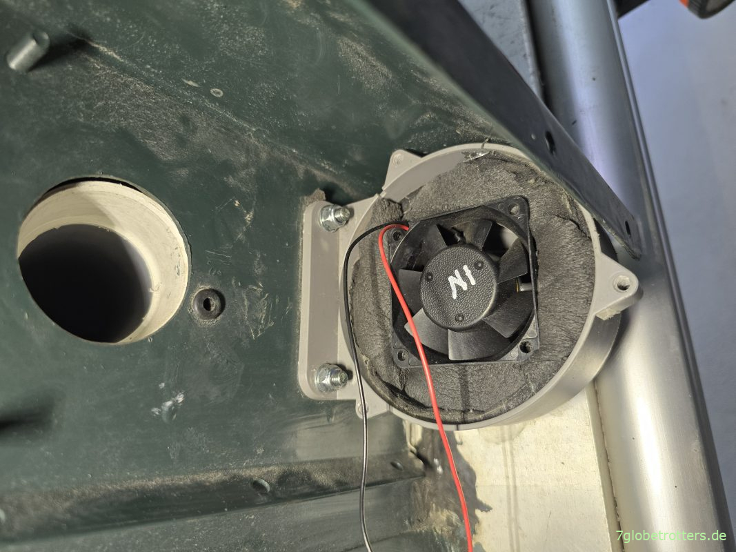 Mittlerweile aber haben sich alle an eine Trockentrenntoilette gewöhnt und ich brauche die Schönheit und Eleganz der wegschwenkenden Kackeimerabdeckung nicht mehr. Kann also die ohnehin klapprige Schwenkmechanik ausbauen und den frei gewordenen Platz für eine direkte Entlüftung nach oben nutzen. Eben so, wie es sich bei der Villa bewährt hat.