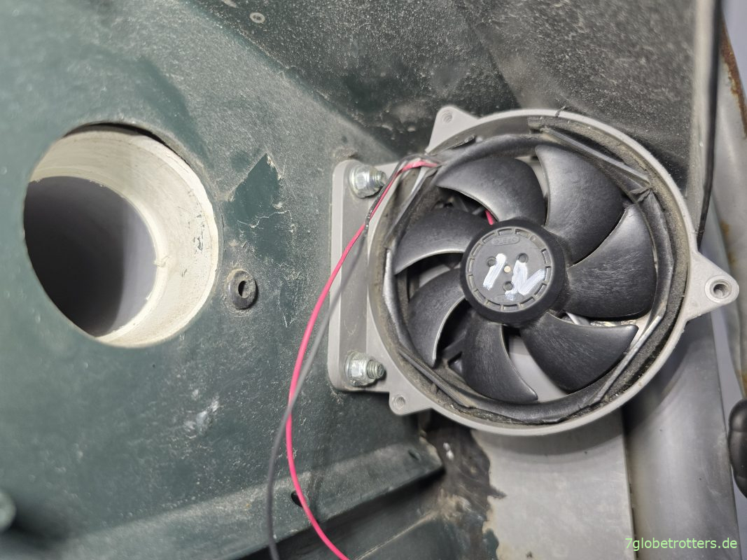 Umbau und Test der Entlüftung der Trockentrenntoilette im Wohnmobil auf außenliegenden Lüfter und Absaugung nach oben.