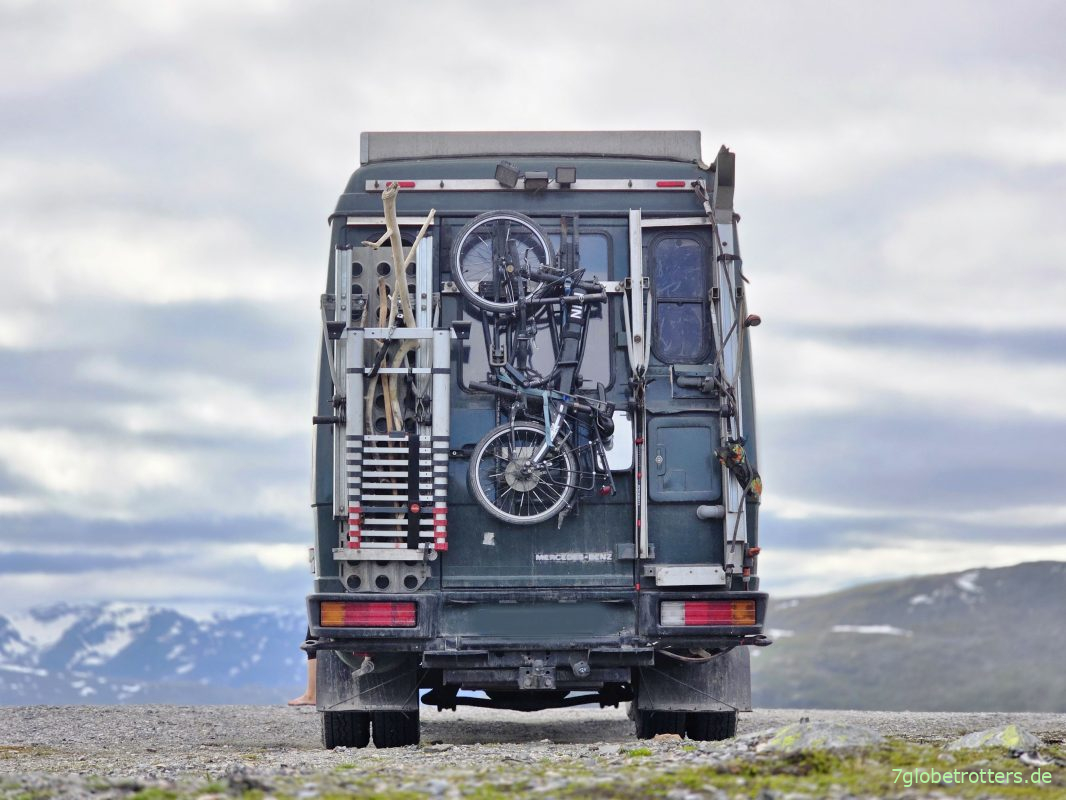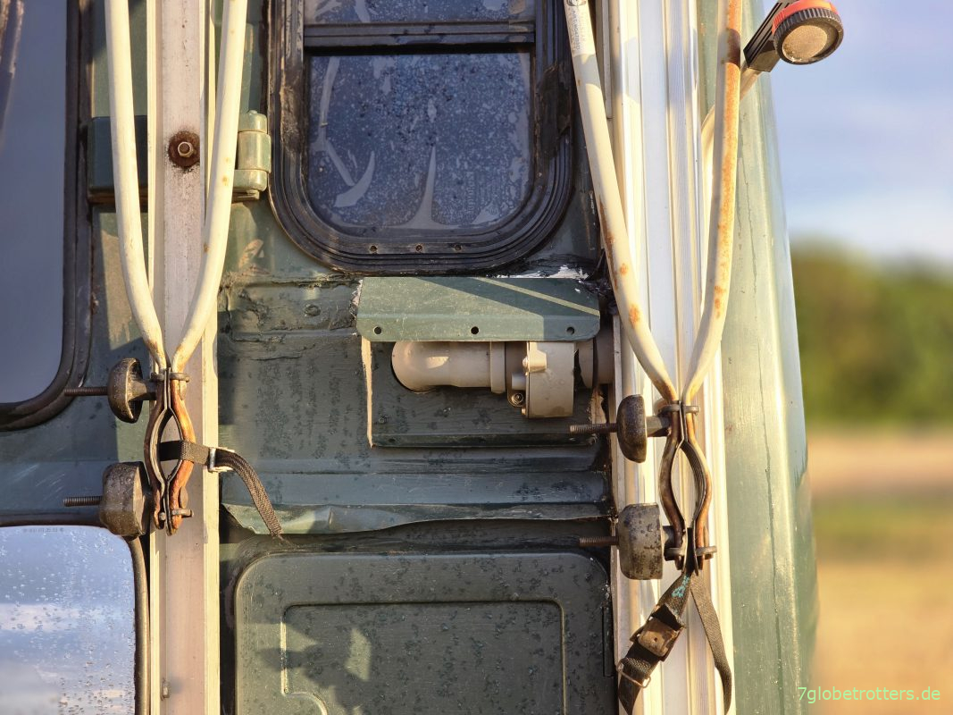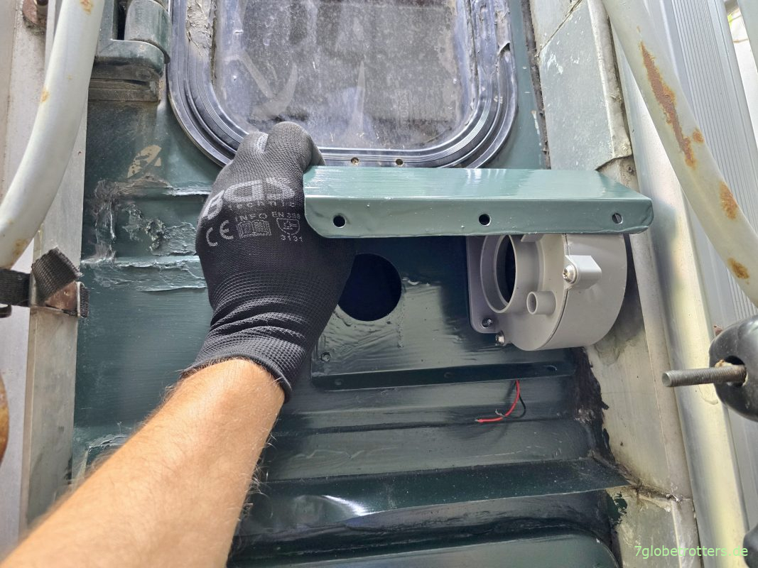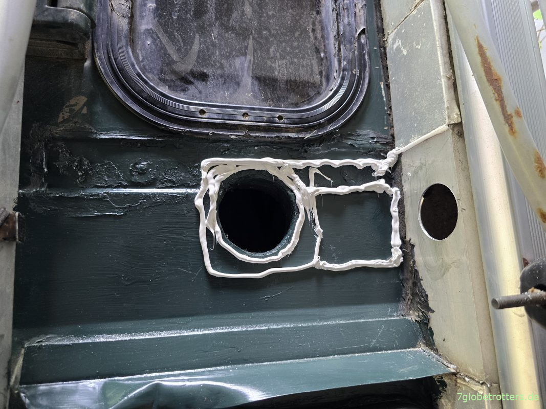 Nun habe ich im Rahmen meiner Experimente schon drei verschiedene Löcher für die Entlüftung in die Heckwand des Wohnmobils gebohrt: Unterhalb der Toilette, ziemlich in der Mitte und oberhalb. Diesmal will ich zusätzlich zur unteren auch die obere Entlüftung nutzen.